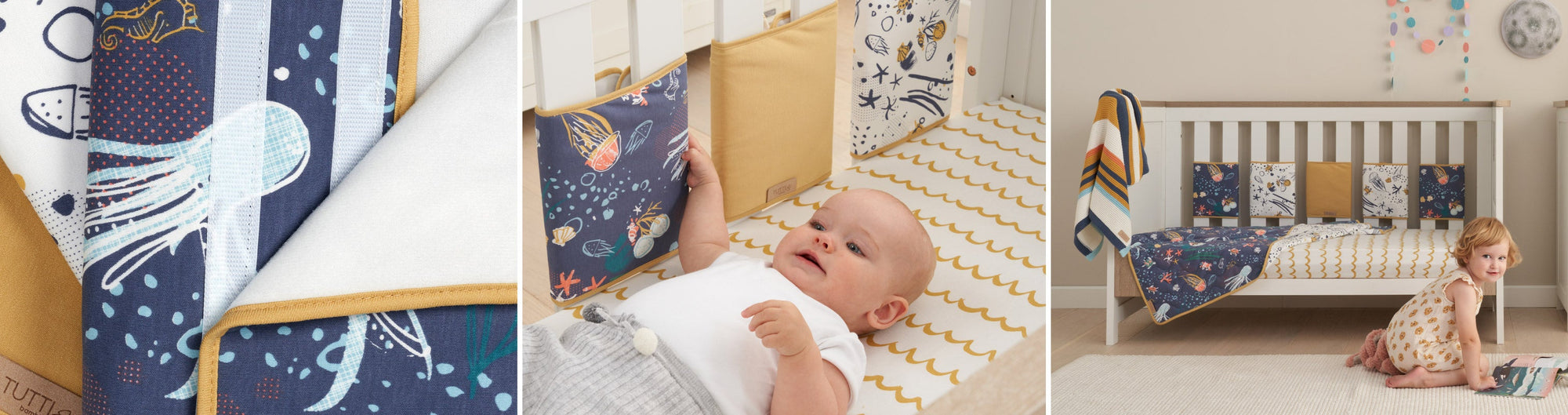 A baby lying on a cot with a yellow and white striped cot wrap around the cot. The wrap features sea life motifs with colorful fish and coral.
