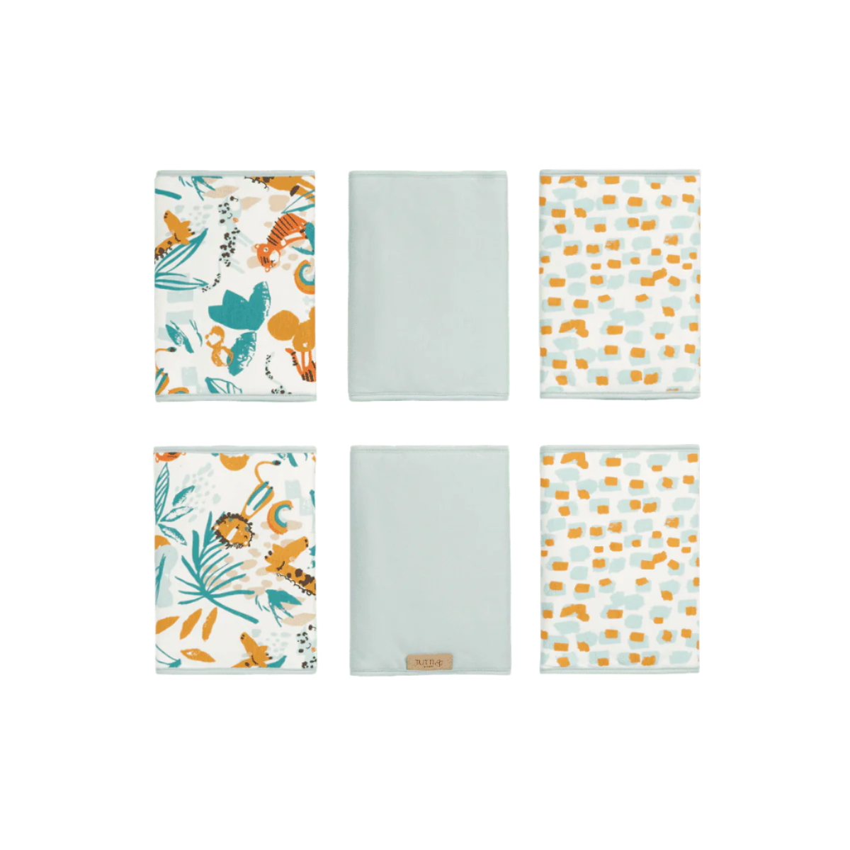 A set of three beige cot wraps with different woodland animal motifs, displayed on a cot.