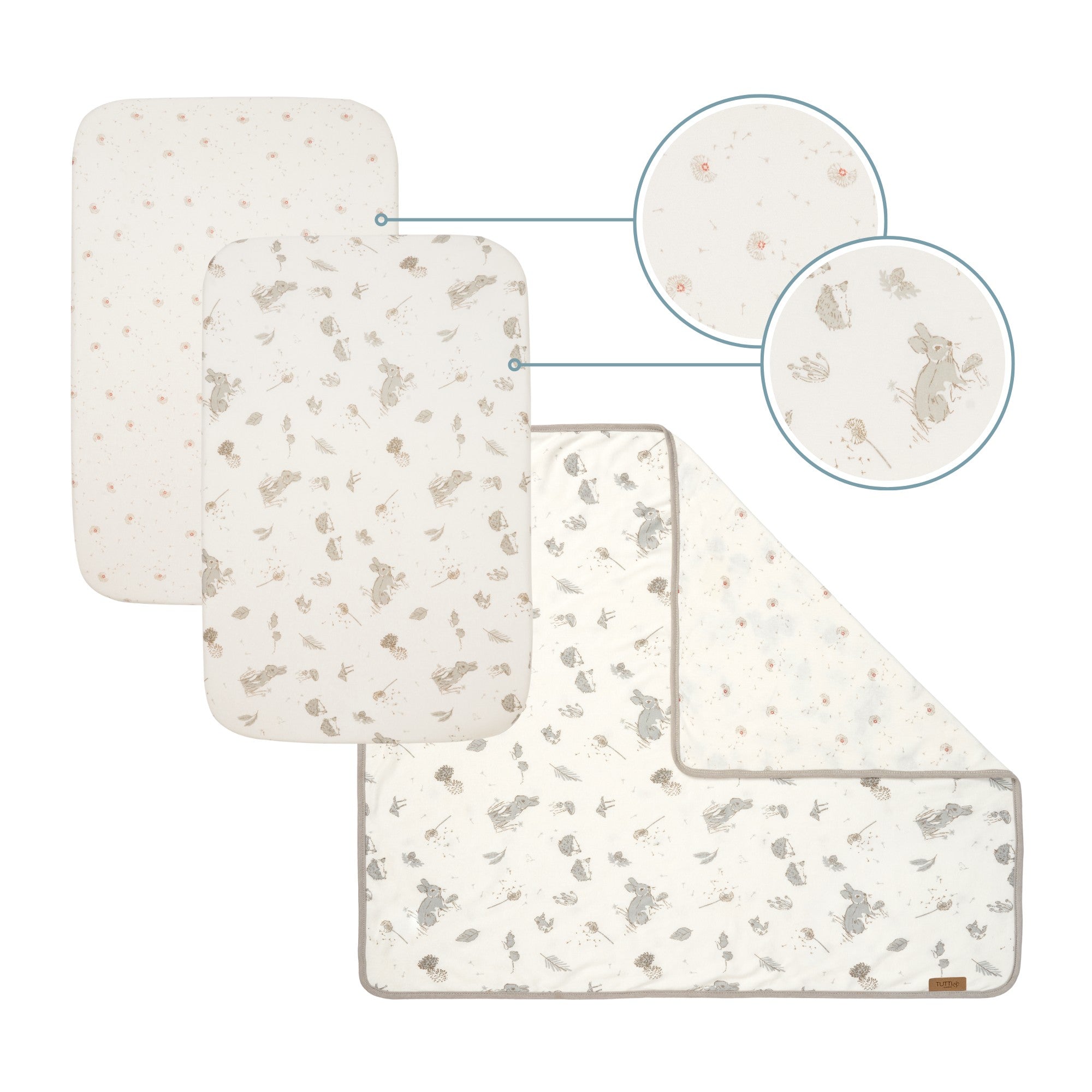 Cocoon bedside crib bundle with woodland print sleep bag and two organic cotton fitted sheets, designed for cosy, safe sleep