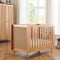 Japandi Mini Cot Bed in light oak with rattan panels, styled in a nursery room. Compact design ideal for smaller spaces.