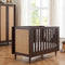 Japandi cot bed in warm walnut finish shown in a bright nursery room, featuring slatted sides and textured rattan end panels for breathability and natural style.
