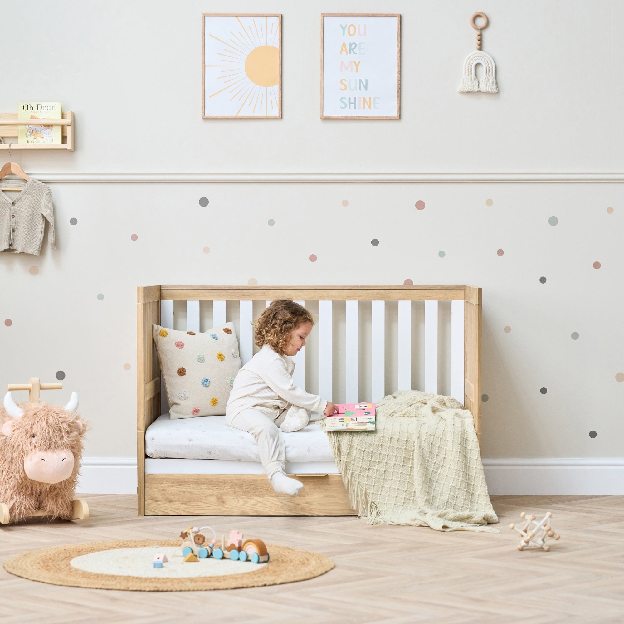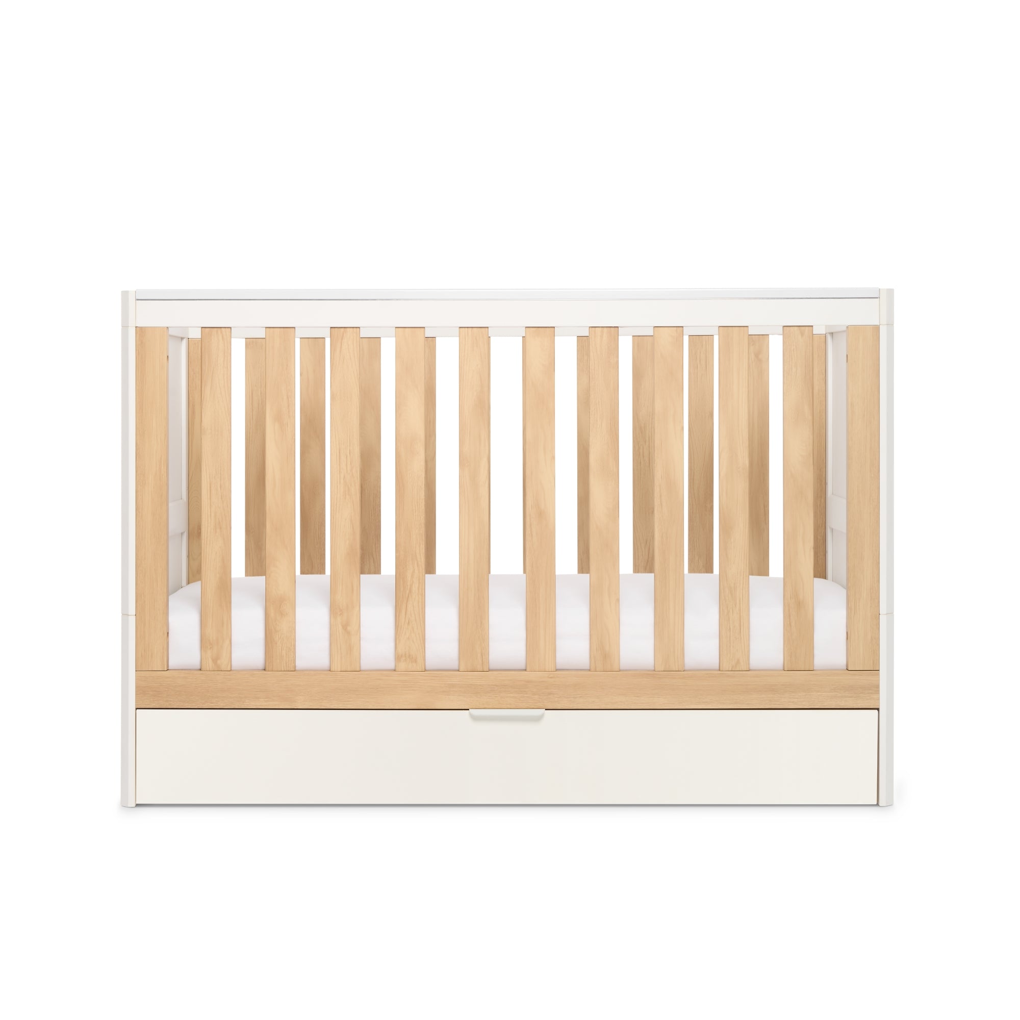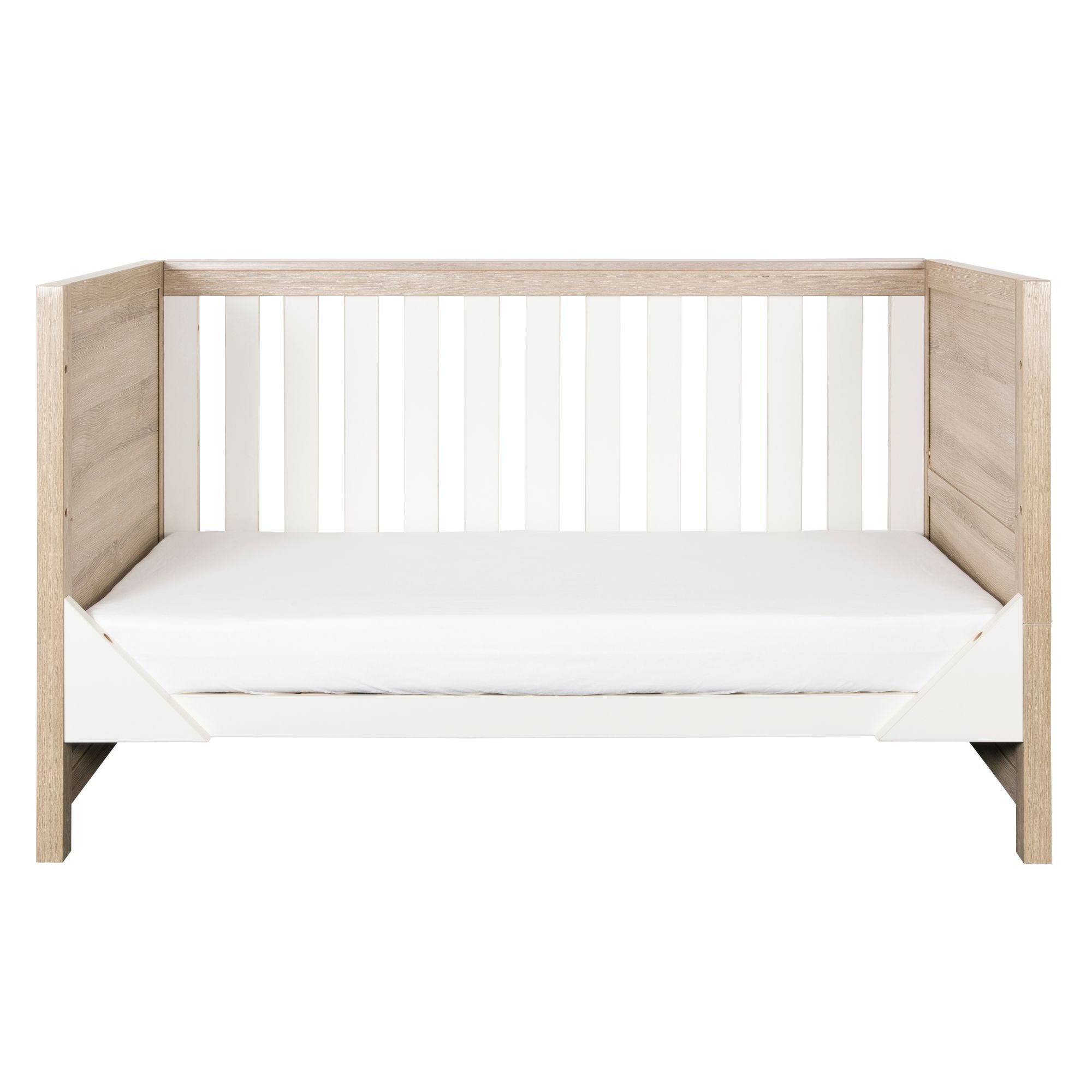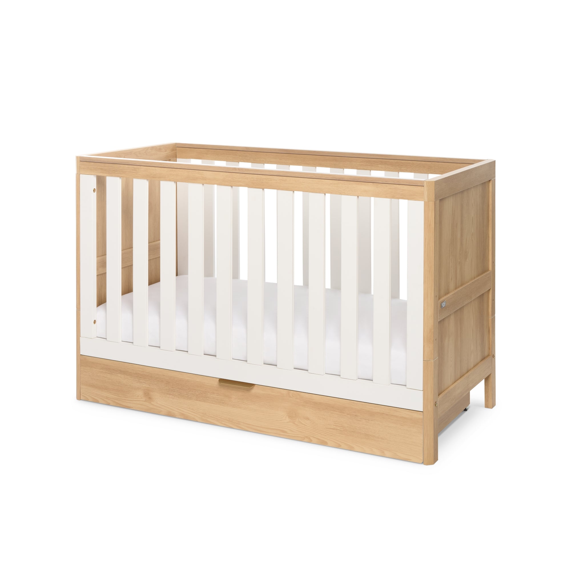 Verona cot bed in white and oak with teething rails, shown in a bright nursery to highlight its solid build and safety-focused slatted sides.