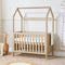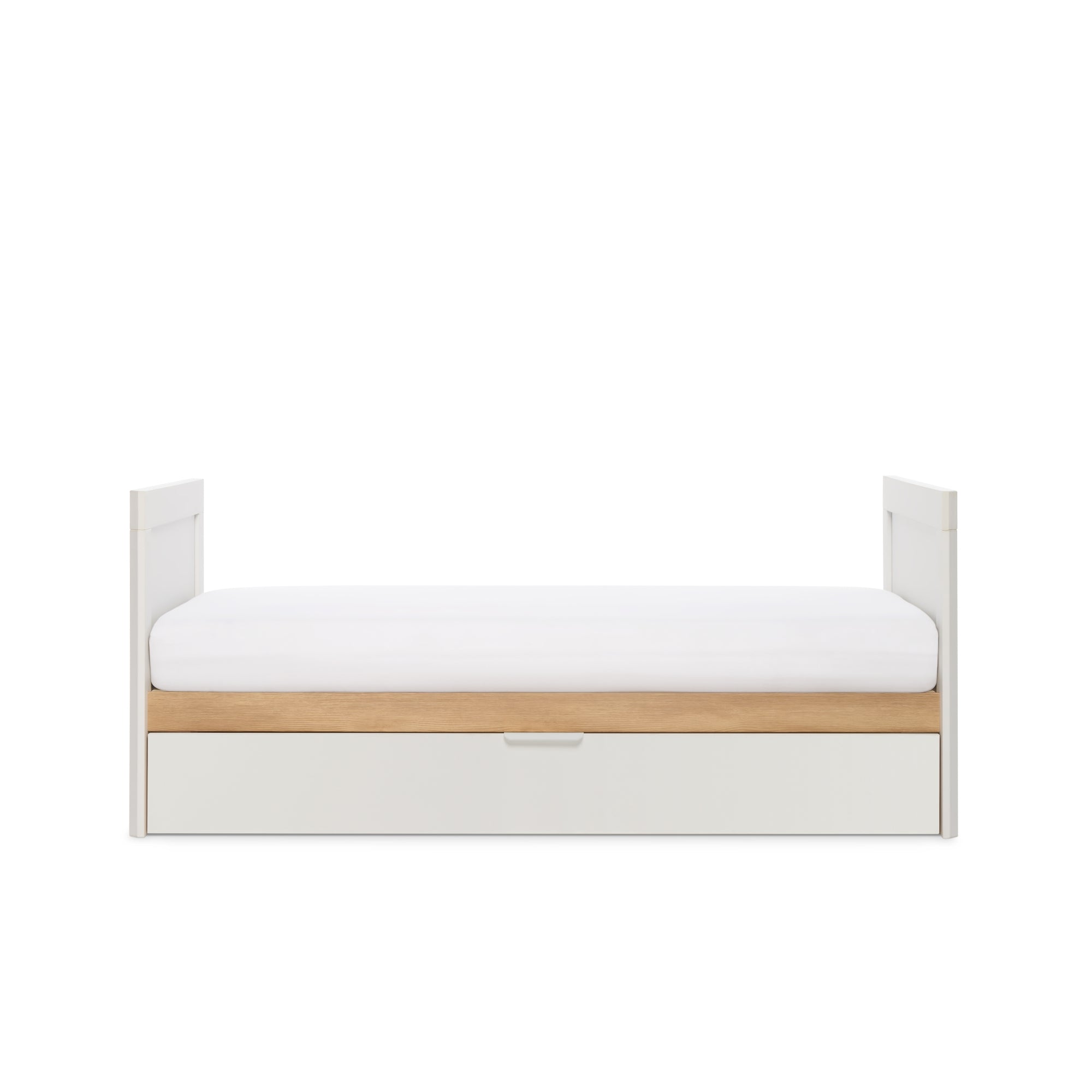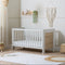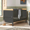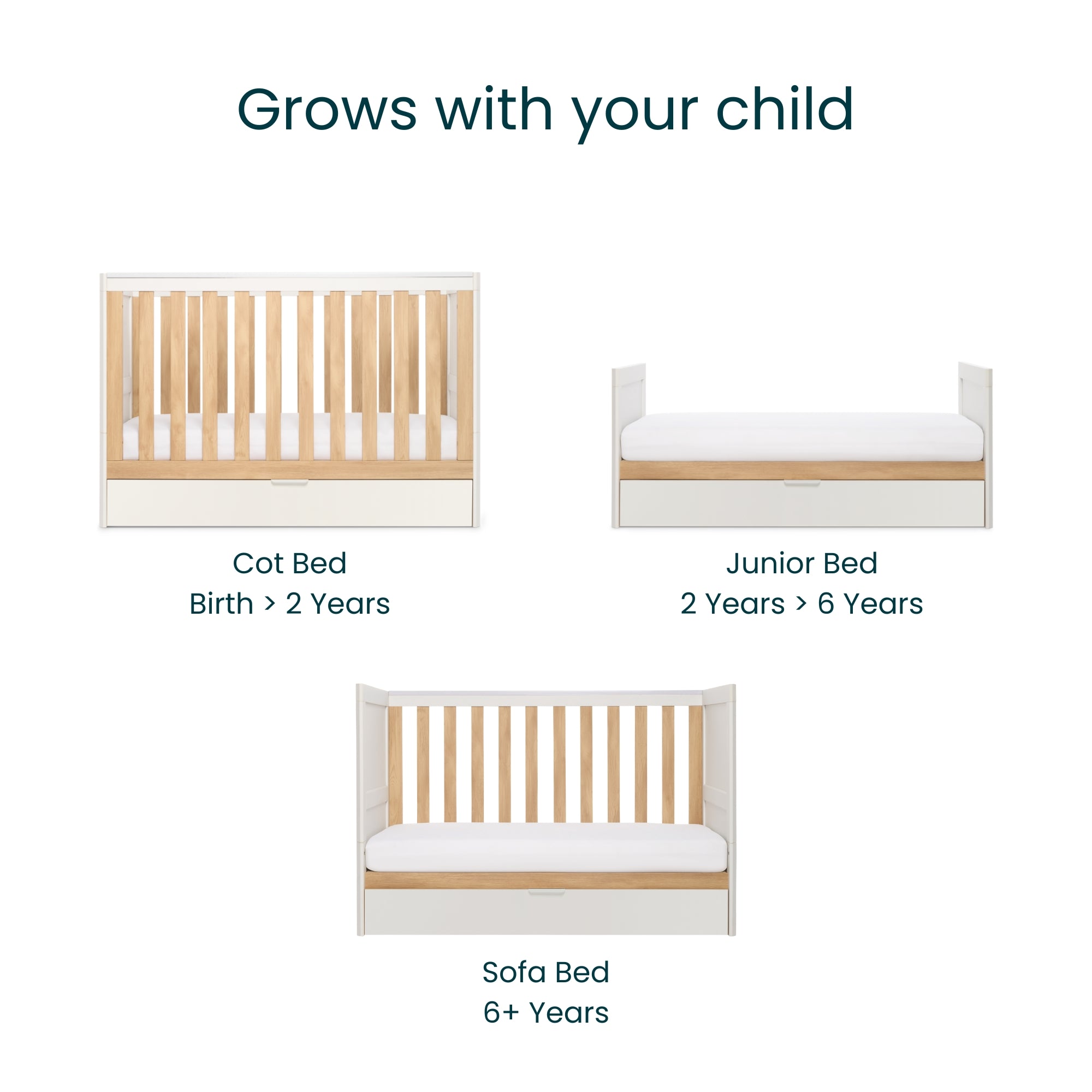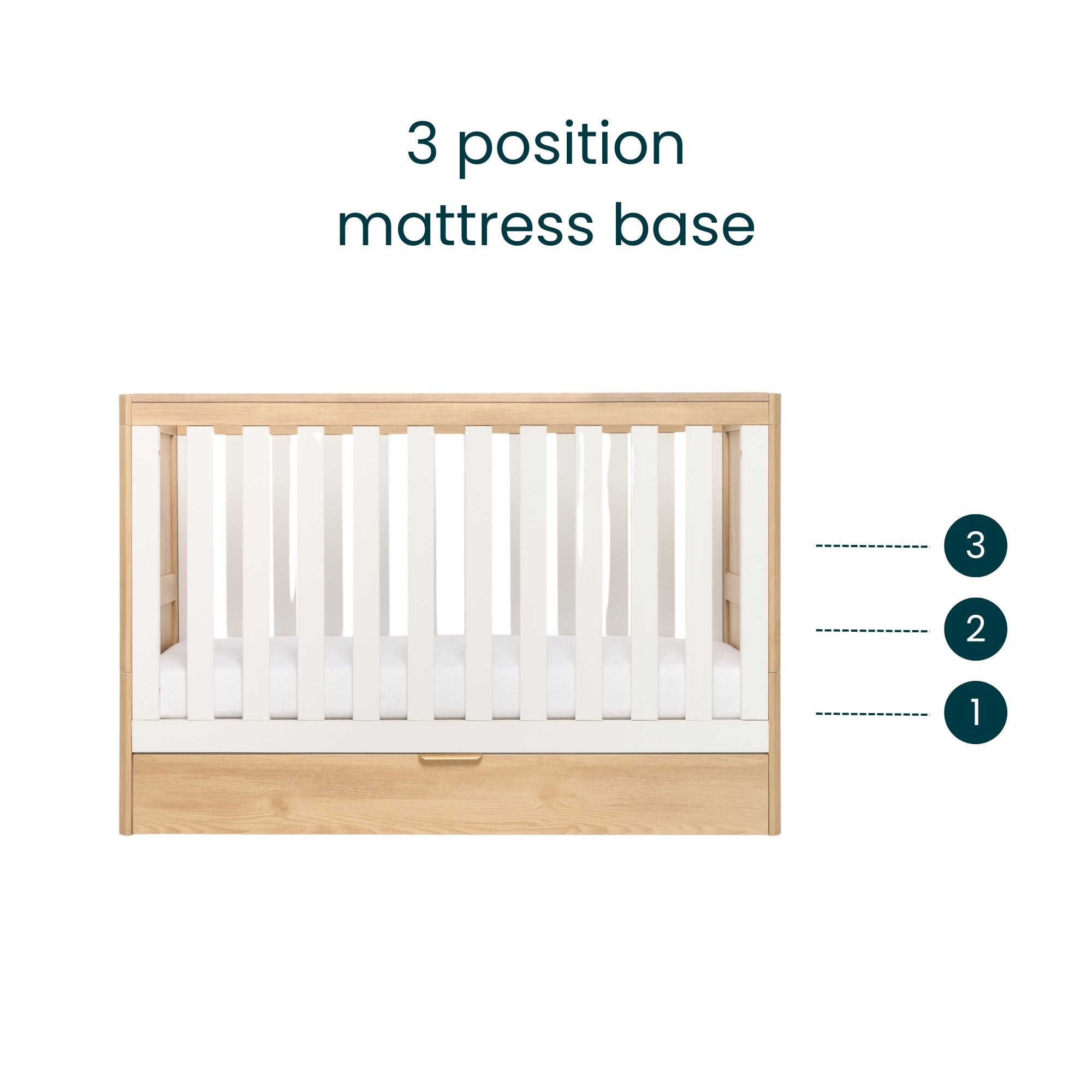 Verona cot bed in white and oak with teething rails, shown in a bright nursery to highlight its solid build and safety-focused slatted sides.