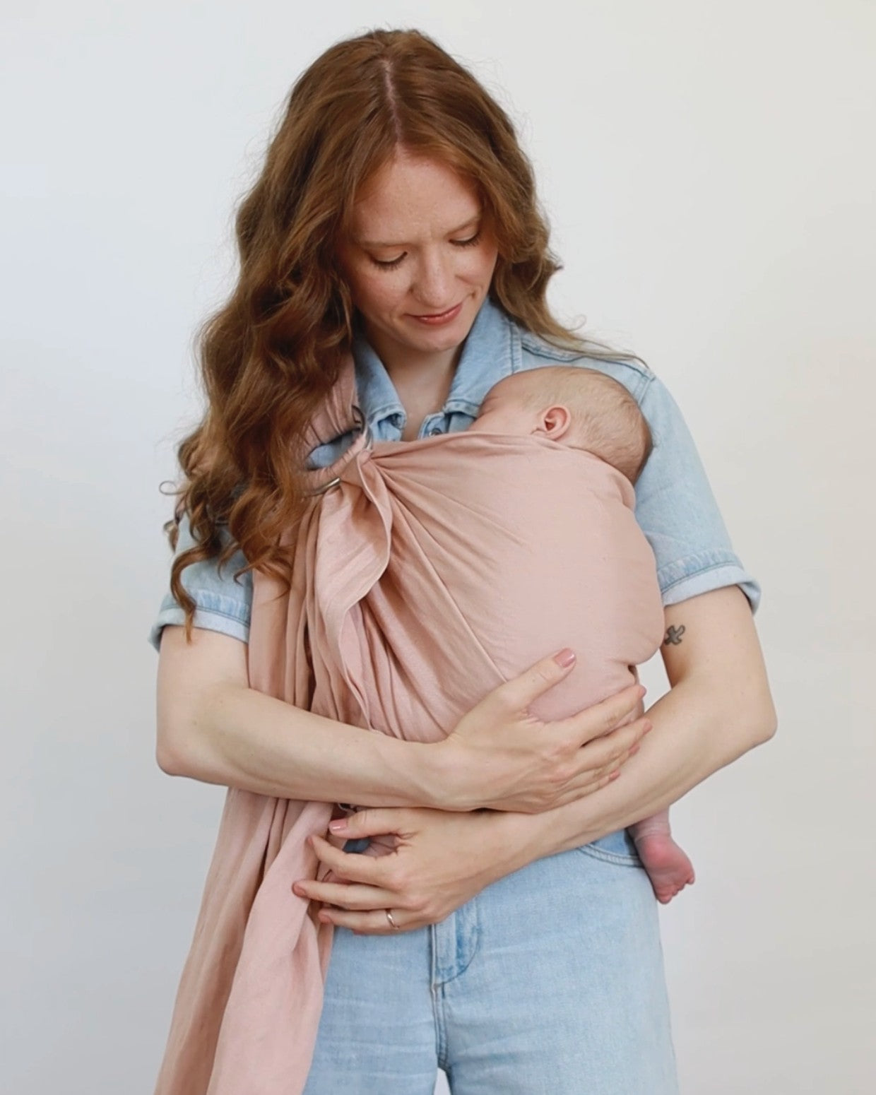 2. Hold your baby in your arms and position them on the ring sling pouch in a secure ergonomic position.