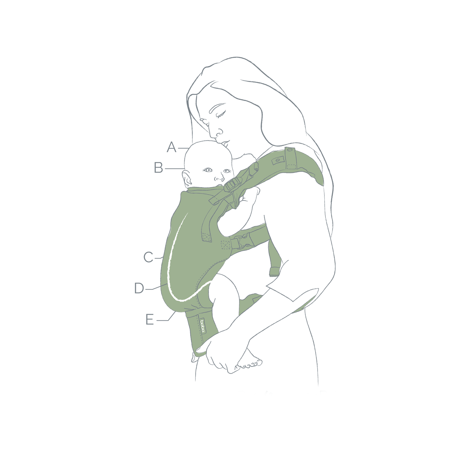 The spread squat oriented towards the parent position allows for good airflow, spine and hip support. It is also a safe position for babies to sleep - not to mention a common favourite place to nap with their little head resting on your chest surrounded by the familiar smell and sound of your heartbeat!