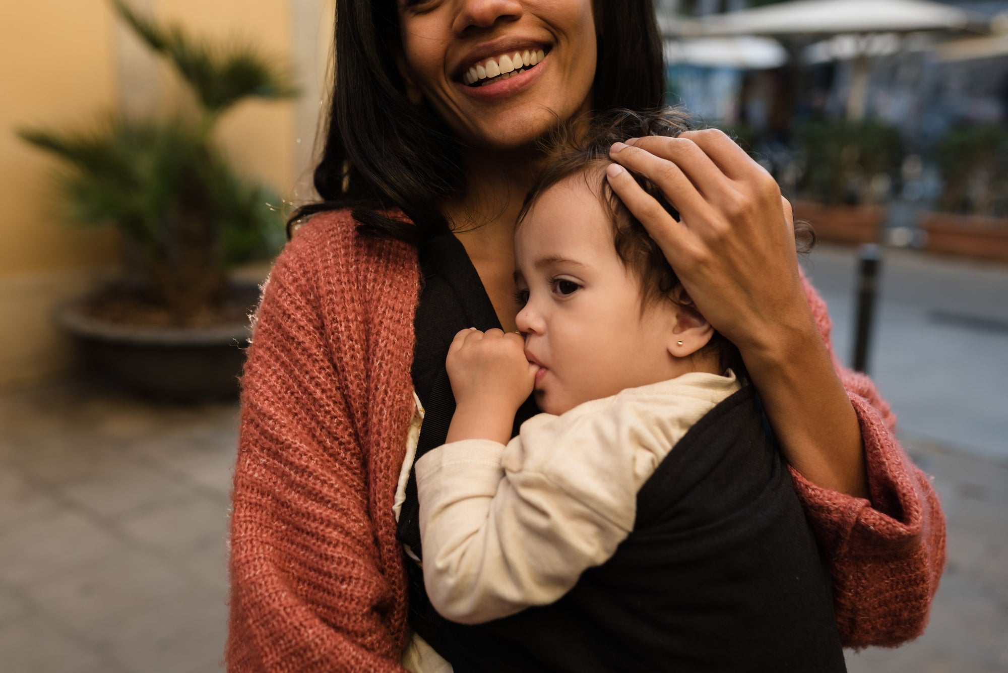 Once positioned correctly, your baby should be snug against your body, high on your chest, enabling you to stand normally, just as if you were holding them in your arms.