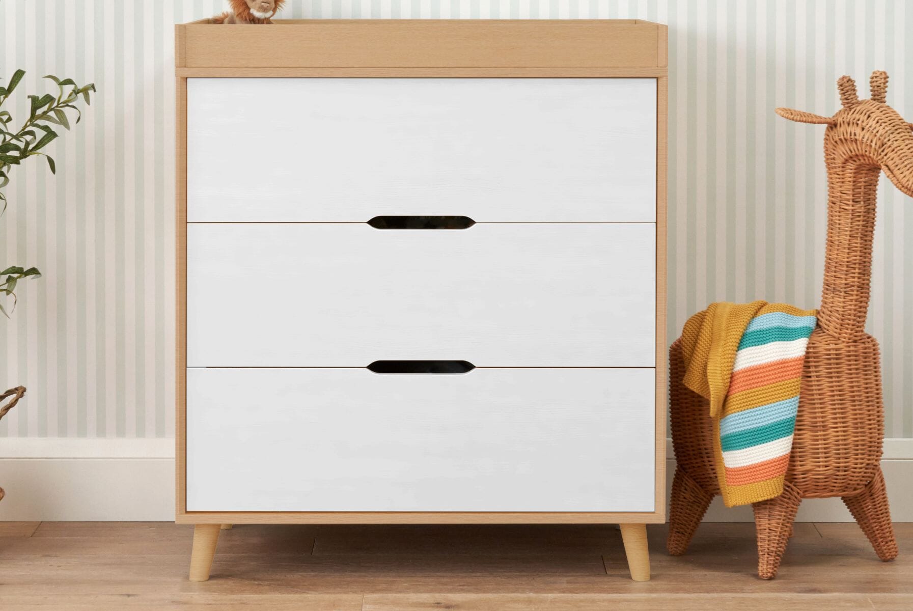 Meet our Fika 2 Piece Room Set in White and Light Oak - a Scandinavian-inspired blend of modern simplicity and functionality. With bevelled edges, stylish splayed legs and chic cut-out handles, it's the ideal choice for those seeking a minimalistic, contemporary nursery look. Practical and versatile, this set includes a cot bed that converts to toddler bed or sofa and a chest changer with ample storage for all your baby’s essentials.