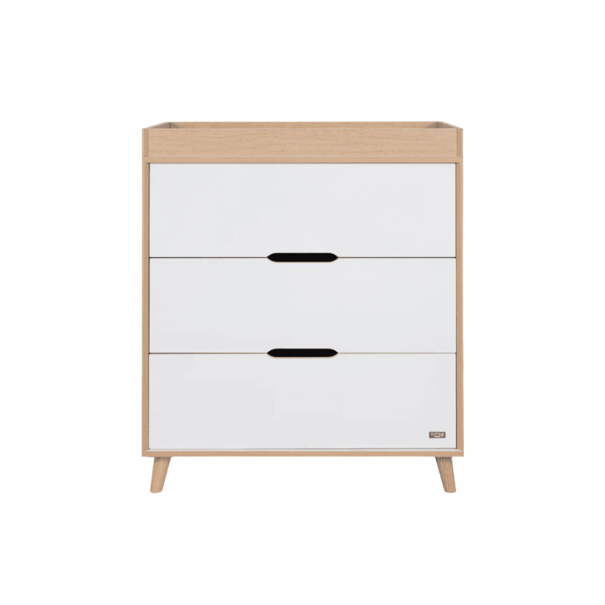 Meet our Fika 3 Piece Room Set in White and Light Oak - a Scandinavian-inspired blend of modern simplicity and functionality. With bevelled edges, stylish splayed legs and chic cut-out handles, it's the ideal choice for those seeking a minimalistic, contemporary nursery look. Practical and versatile, this set includes a cot bed that converts to toddler bed or sofa, a chest changer with changing top and wardrobe with ample storage for all your baby’s essentials.