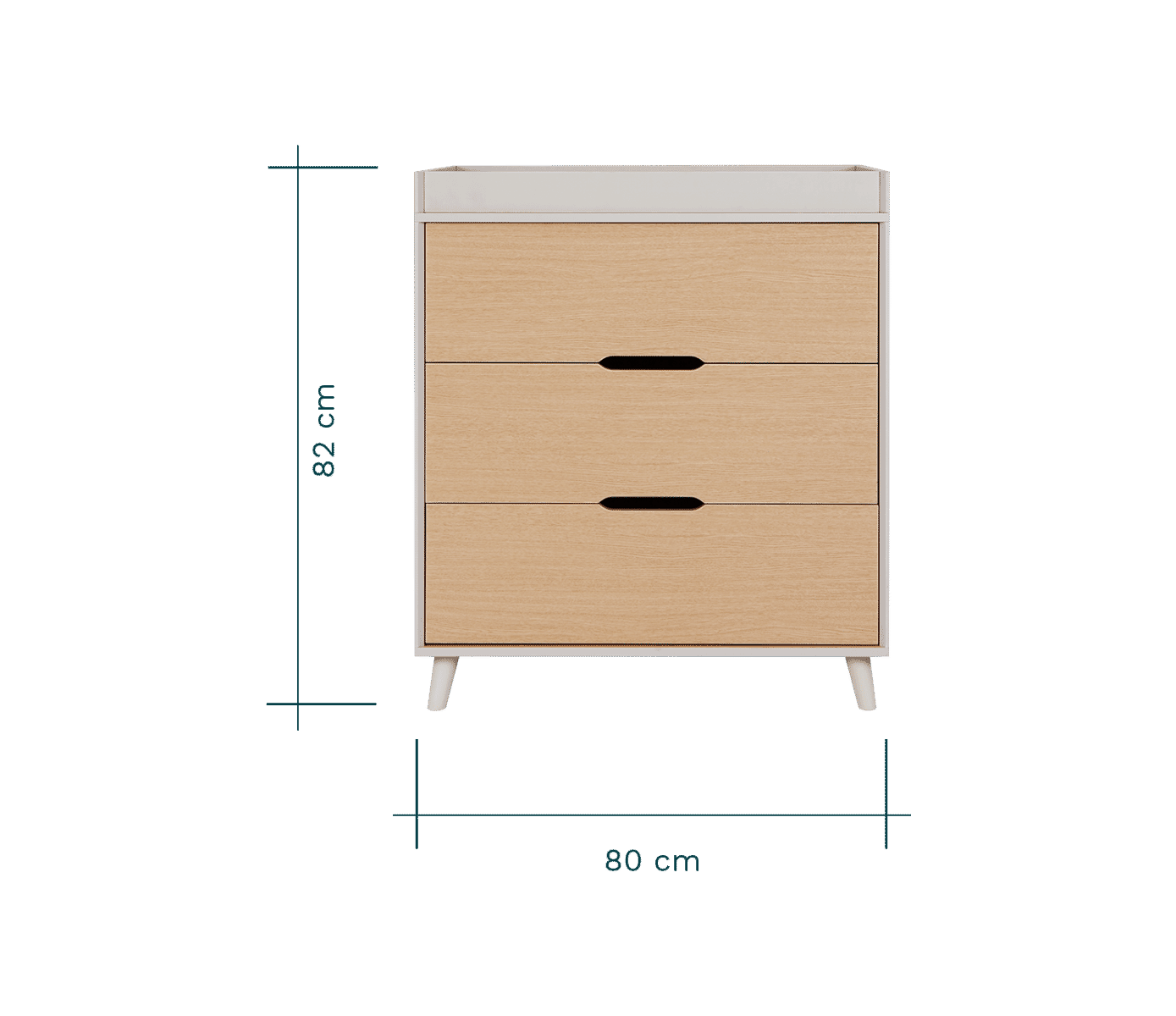 Meet our Fika Chest Changer in Light Oak and White Sand - a Scandinavian-inspired blend of modern simplicity and functionality. Featuring stylish splayed legs and chic cut-out handles, it's the ideal choice for those seeking a minimalistic, contemporary nursery look. This chest seamlessly blends style with functionality, offering a safe changing area and three spacious drawers to organise all your baby's essentials.