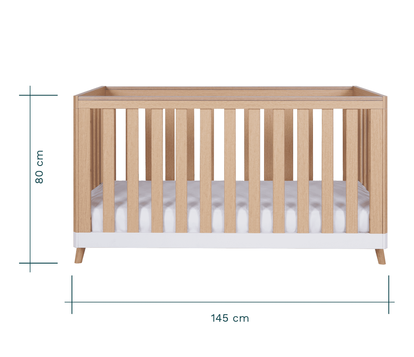 Meet our Hygge 3 Piece Room Set in White and Light Oak - a Scandinavian-inspired blend of modern simplicity and functionality. With bevelled edges, stylish splayed legs and chic cut-out handles, it's the ideal choice for those seeking a minimalistic, contemporary nursery look. Practical and versatile, this set includes a cot bed that converts to toddler bed or sofa and a chest changer with ample storage for all your baby’s essentials.