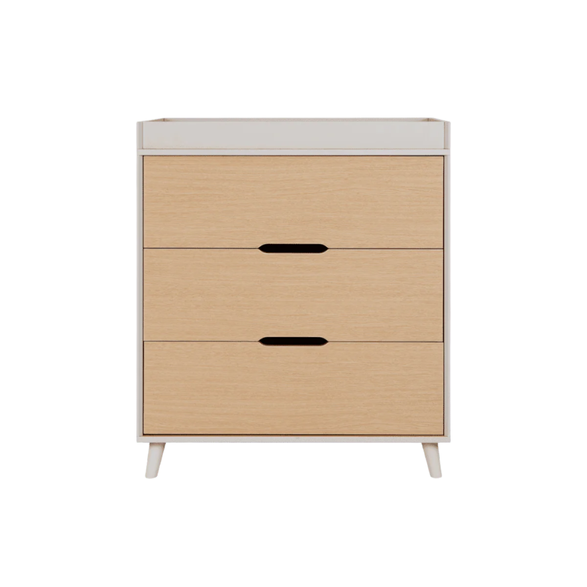 Meet our Hygge Mini 2 Piece Set in Light Oak and White Sand - a Scandinavian-inspired blend of modern simplicity and functionality. With bevelled edges, stylish splayed legs and chic cut-out handles, it's the ideal choice for those seeking a minimalistic, contemporary nursery look. Practical and versatile, this set includes a space saving cot bed that converts to toddler bed or sofa and a chest changer with ample storage for all your baby’s essentials.
