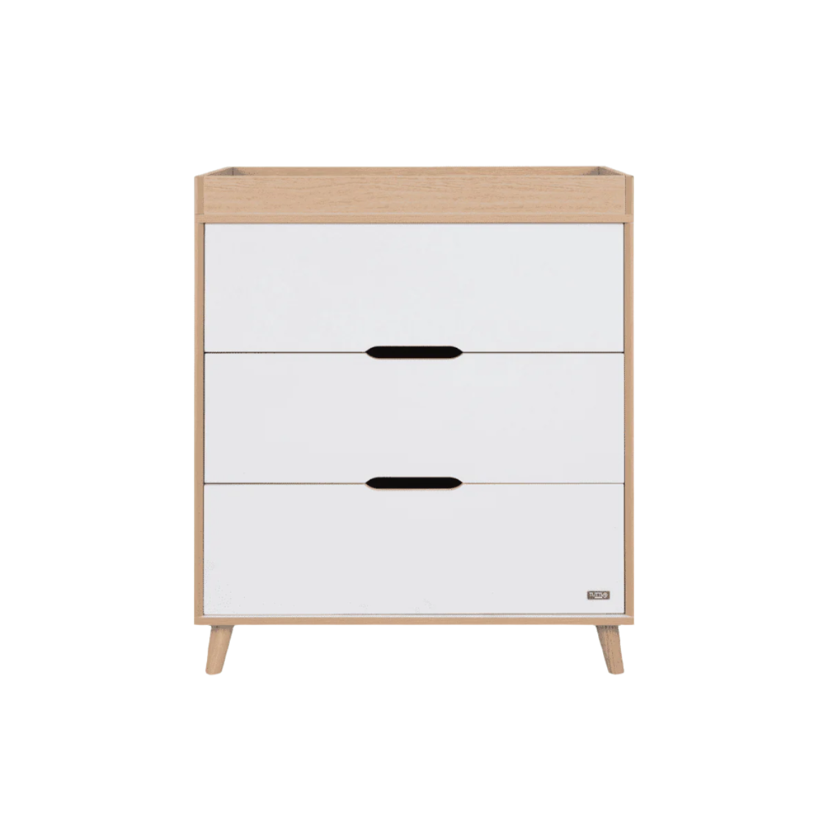 Meet our Hygge Mini 3 Piece Room Set in White and Light Oak - a Scandinavian-inspired blend of modern simplicity and functionality. With bevelled edges, stylish splayed legs and chic cut-out handles, it's the ideal choice for those seeking a minimalistic, contemporary nursery look. Practical and versatile, this set includes a space saving cot that converts to toddler bed or sofa, a chest changer and a wardrobe with ample storage for all your baby’s essentials.