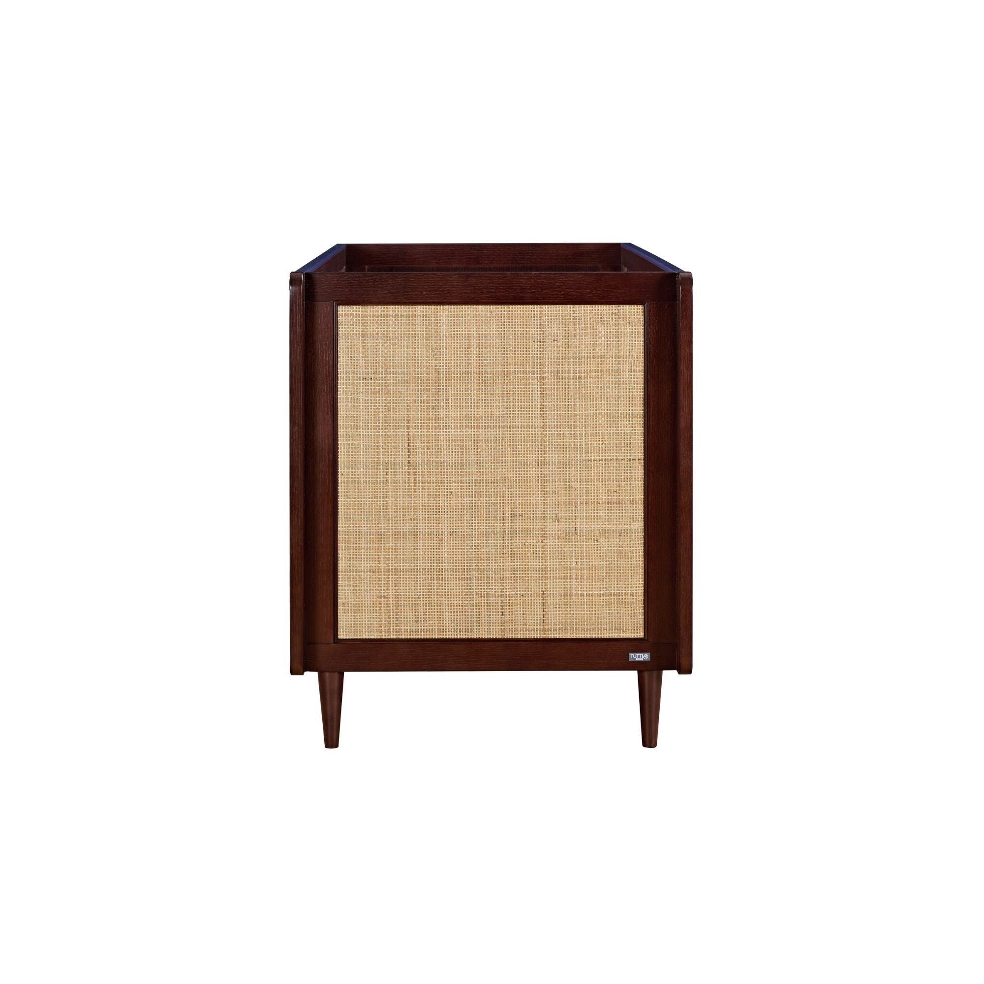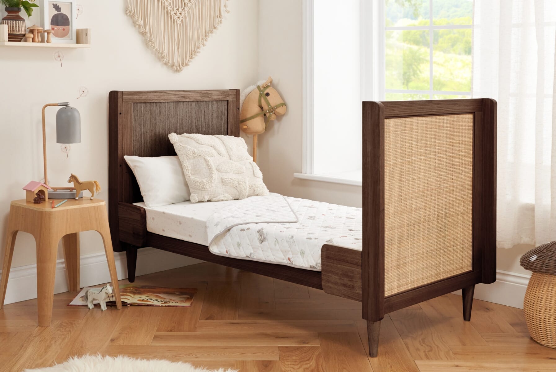 Crafted with a harmonious blend of natural rattan and wood textures, our Japandi Cot Bed in Warm Walnut is both stylish and practical, offering 3 adjustable mattress heights and conversion to toddler bed or sofa mode. A fusion of Japanese and Scandi style, the design embodies a sense of tranquillity, for a serene and sophisticated nursery look.