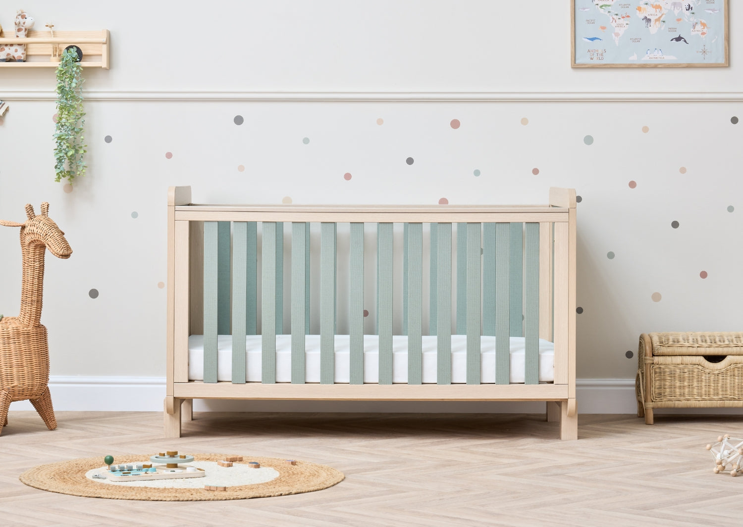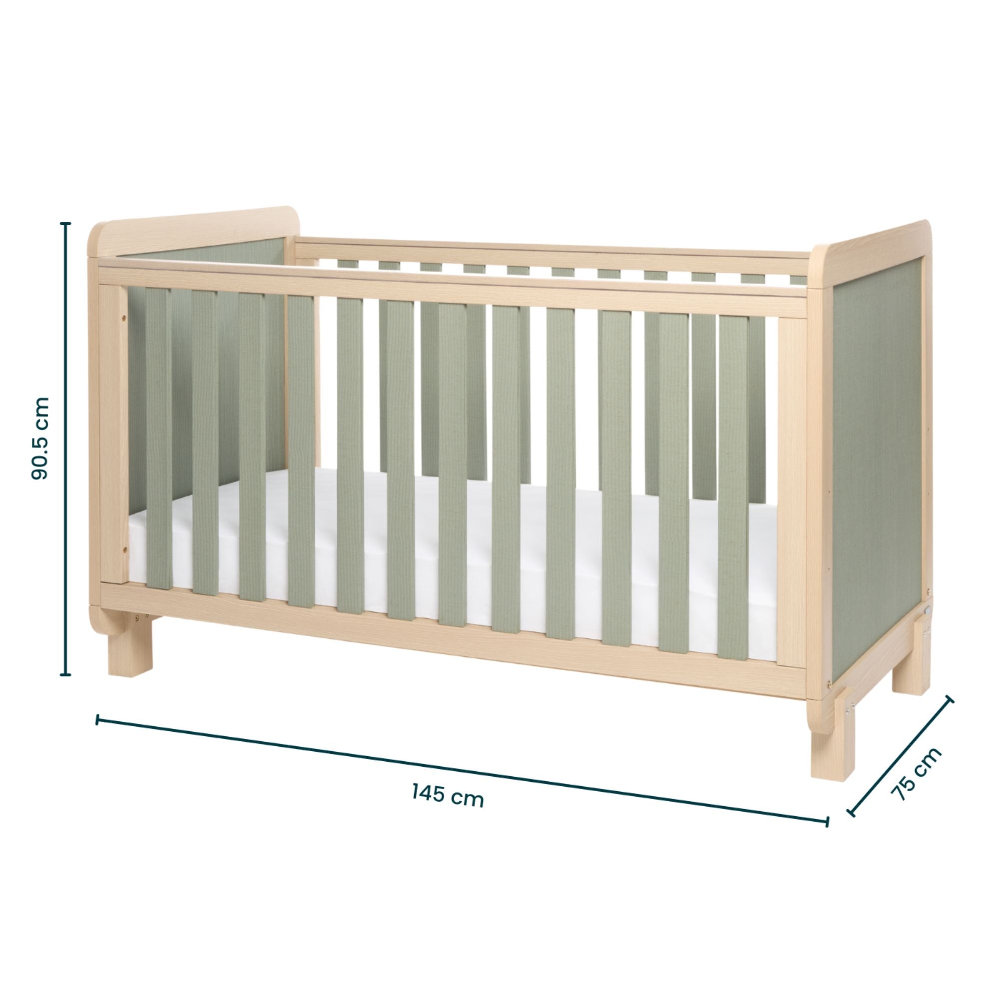 Introducing Kuba - a practical Scandi-style cot bed, with rounded corners, sturdy block legs, and a distinctive sage weave texture on the ends and slats, all beautifully complemented by a pickled oak frame. Designed to grow with your child, it effortlessly transitions from a cosy cot to a junior bed, complete with a matching bed guard for added safety. Thoughtful details like teething rails and three adjustable mattress heights ensure both comfort and convenience. Combining modern craftsmanship and functionality, the Kuba Cot Bed creates a serene and stylish sleep space for your little one to thrive.