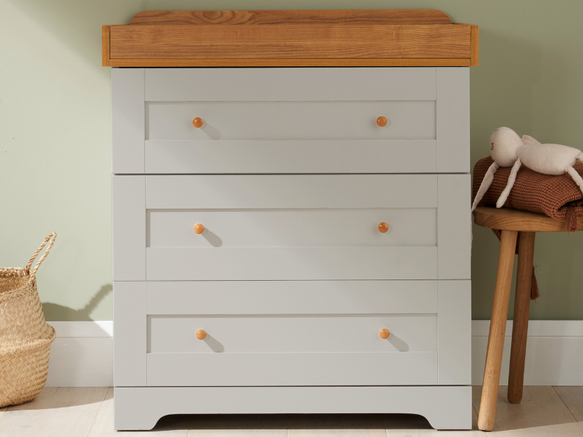 This Rio Chest Changer is an ideal addition to your baby's furniture set and is designed to complement both the Rio and Malmo cot beds. Finished in Dove Grey and Honey Oak, this stylish changing chest of drawers adds plenty of storage to your nursery.