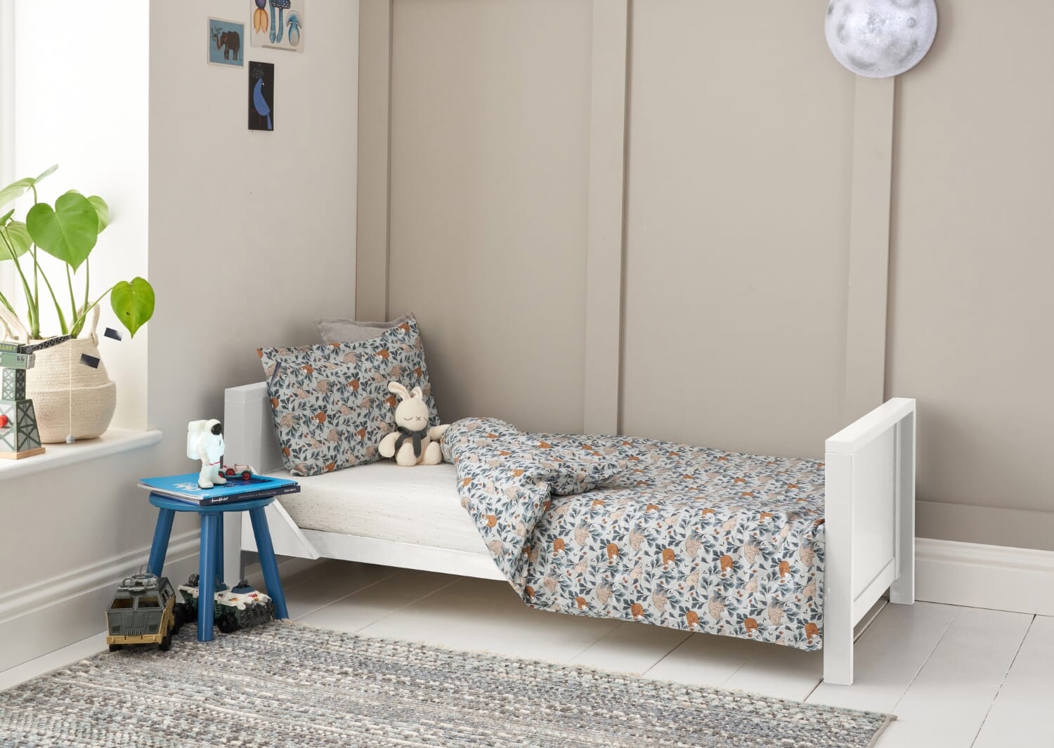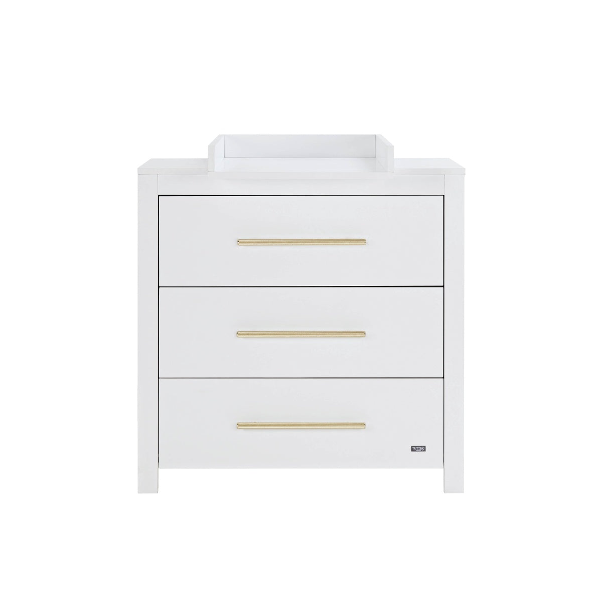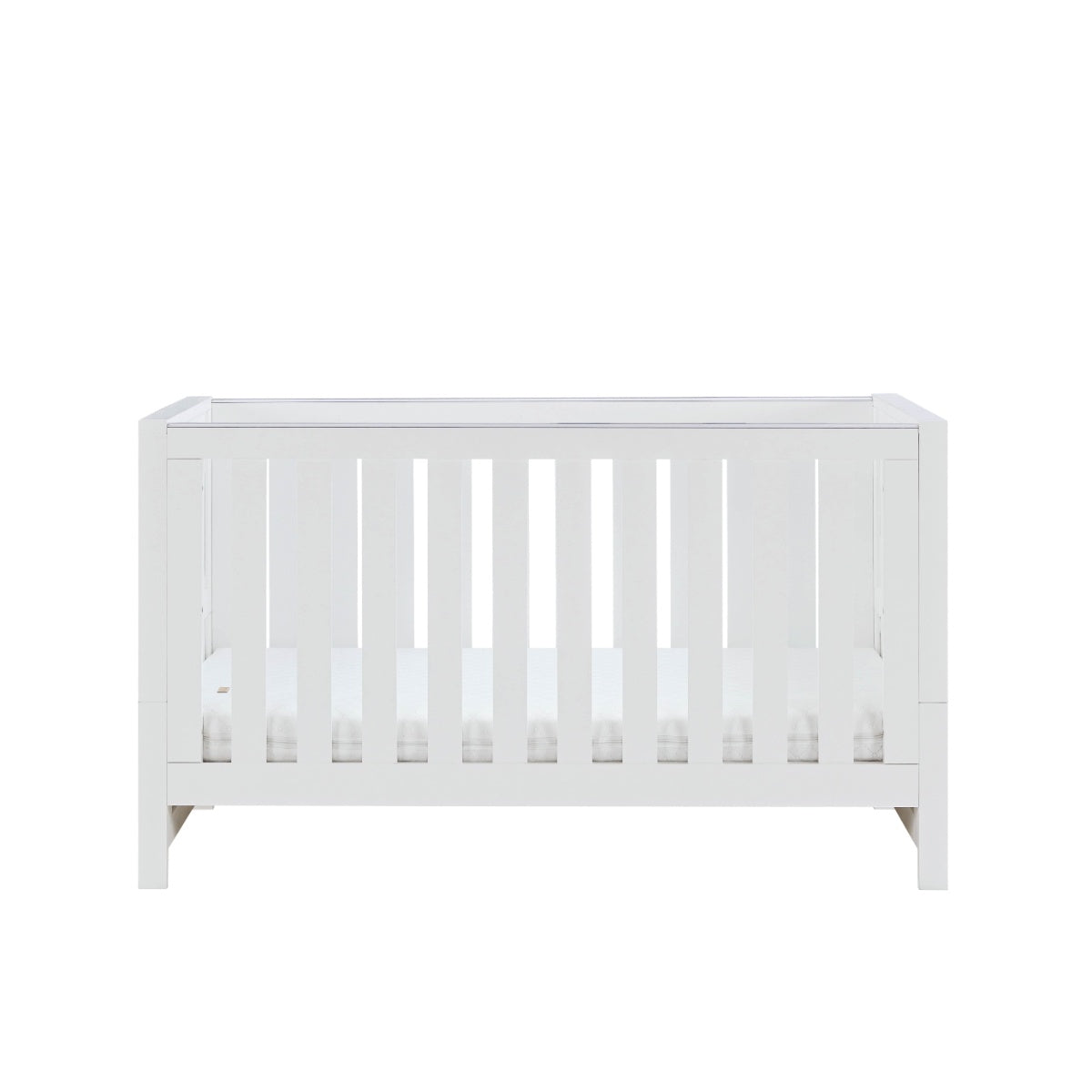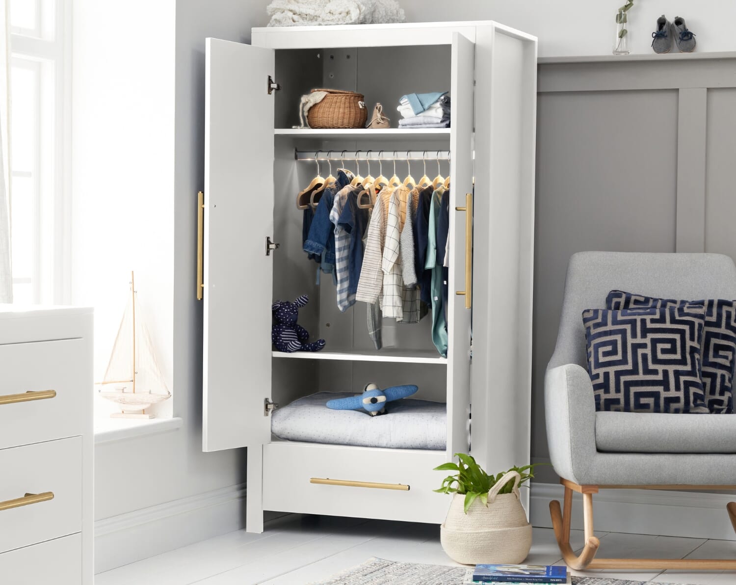 Boasting an elegant silhouette and distinctive design elements, the Tivoli 3 Piece Room Set in White adds a fresh and sophisticated touch to any contemporary nursery. The set includes a versatile cot bed, seamlessly transformable into a toddler bed or sofa, complemented by ample storage space in the chest changer and wardrobe.